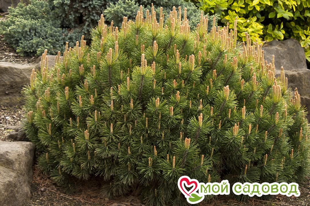 Сосна горная Мугус Произрастает культура в Южной и Центральной Европе. Сосна Мугус выживает там, где не растут обычные деревья: на песках, в высокогорье, на камнях. В естественной среде этот вид образует непроходимые заросли, состоящие из множества саблевидно изогнутых веток, причудливо переплетённых друг с другом. Ботаническое описание Это кустарниковая разновидность густой сосны. Характеризуется стелющейся распростёртой кроной. В диаметре достигает 2 – 3 м, а в высоту – 3 м. Ежегодный прирост составляет 12 см в ширину и 10 см в высоту. Побеги изогнутые верх и довольно короткие. Хвоя размером около 4 см, тёмно-зелёной окраски, жёсткая, игольчатая, собранная в пучки по 2 хвоинки. Начиная с 6 – 8-летнего возраста образуются шишки. По форме они конусовидные, сидячие, длиной 3 – 6 см. Цвет у плодов светло-коричневый. На дереве шишки смотрятся очень декоративно. Корневая система у саженцев поверхностная, сильно разветвлённая. Применение Сосна горная Мугус активно используется в качестве почвопокровной культуры, а также для озеленения склонов. Особенно интересно растение в виде живой изгороди. Благодаря холодоустойчивости и неприхотливости это идеальный вариант для посадок на лоджиях, балконах, контейнерного озеленения. Также ландшафтные дизайнеры задействуют хвойник во всех типах композиций и групповых посадок, для создания массивов и украшения классических альпинариев. Агротехника Саженцы сосны горной Мугус плохо развиваются в тени, поэтому лучше для них выбирать солнечные участки. Эта культура абсолютно нетребовательна к кислотности и гранулометрическому составу грунта. В природе хвойник растёт в основном на щелочных дренированных породах (например, известняках и доломитах). В культуре многолетник хорошо себя чувствует на крупнообломочных включениях. Он благополучно переносит временное переувлажнение, но негативно реагирует на засоление и уплотнение почвы. При высадке рассады в тяжёлую и влажную землю для засыпки посадочной лунки используют торф и речной песок. В качестве дренажа подойдёт гравий или битый кирпич (толщина слоя 20 см). Если в субстрате много песка, то желательно добавить глину. Почвенную смесь для растений готовят из песка и дерновой земли (1:2). Оптимальным периодом для посадки горной сосны Мугус считается весна (последние числа апреля – первая половина мая). Также работу можно провести осенью, в третьей декаде августа или середина сентября. Интервал между саженцами — 1,5 м. При их заглублении в лунке важно чтобы корневая шейка располагалась на уровне земли. После посадки следует полить и замульчировать приствольную зону. Уход за горной сосной Мугус нужен минимальный. Это засухоустойчивое растение, поэтому полив проводится, пока рассада не укоренится. Взрослым деревьям нужно меньше воды, благодаря образованию в приствольных кругах толстой подстилки. Она сохраняет влагу и способствует скоплению гумуса. Заболеваниями и вредителями многолетник не поражается. Также культура легко поддаётся формировке. При уменьшении годичных побегов замедляется рост кроны. В результате она становится более плотной и густой. Молодые сосенки могут повредить солнечные ожоги. Следовательно, для защиты нежной хвои саженцы укрывают лапником. В средине апреля материал нужно снять, чтобы избежать выпревания посадок. Преимущес